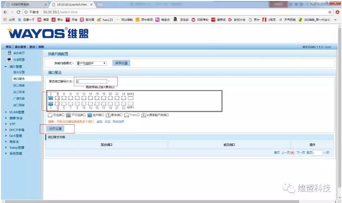 ▲  在端口管理→端口聚合,选择配置相同的聚合组2,选择要聚合的端口这里以1、2端口为例,点击保存设置;