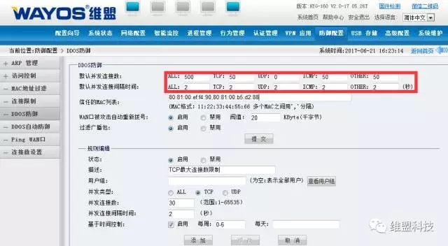 1、限制TCP、UDP、ICMP、OTHER协议允许时间内的并发连接数,防止因攻击引起的拥塞;