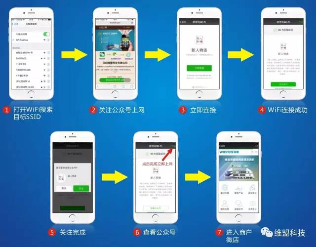 走进一家店,你选择了它的Wi-Fi,连接后自动跳转到了你的微信这时,点击“关注公众号”即可上网~