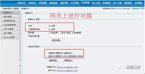 网吧二维码认证是配合维盟无线联盟平台使用的,所以开始设备一定要绑定到商户下,设备成功连接服务器 !