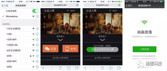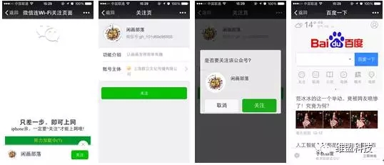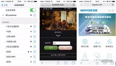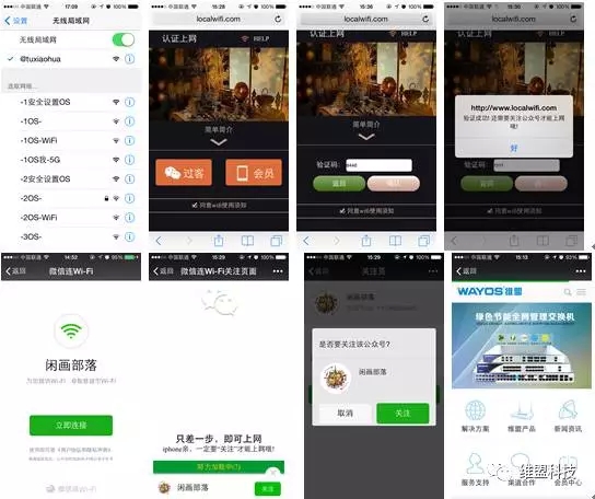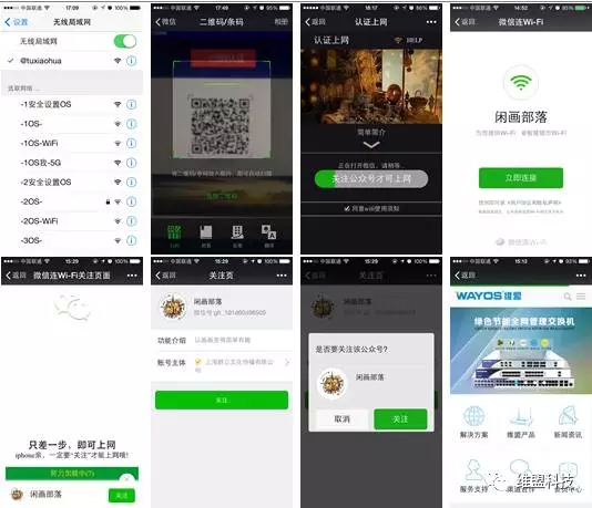 (使用过客上网)连接SSID—>弹出认证页面,使用过客上网—>唤醒微信走微信连WIFI流程—>关注成功点击完成并上网(苹果手机和安卓手机的流程都是一样的)