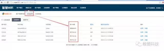 使用二维码认证或者微信连WIFI的用户可以在店中看到;用客户端的验证码或者超级验证码上网的用户,客户来源就是用户名认证,如果开启了增值或者过客上网走了微信连WIFI流程的,客户来源就是微信连WIFI~