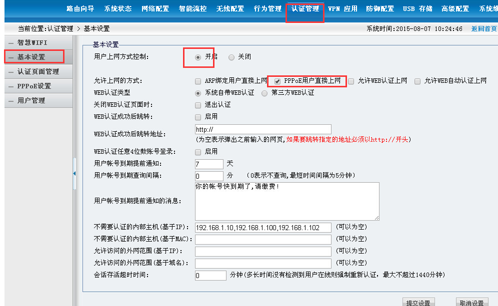 二、进入路由器选择“认证管理”—“基本设置”,“用户上网方式控制”选择开启。允许上网方式选择“PPPOE用户直接上网”。提交设置。如下图。