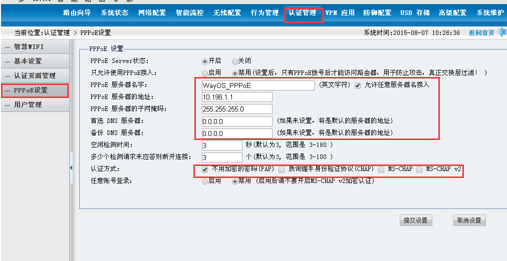 三、PPPOE设置,在“认证管理”下的“PPPoE设置”设置,如下图: