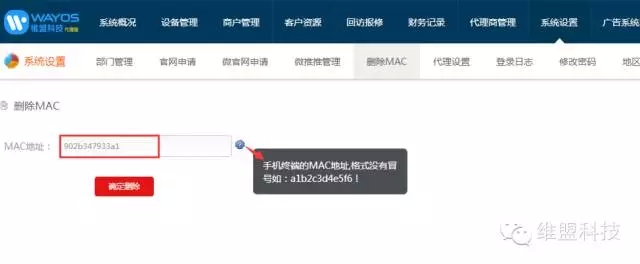 首先登录智慧WiFi后台,通过“系统设置”>>“删除MAC地址”,输入要删除的MAC地址。如下图所示: