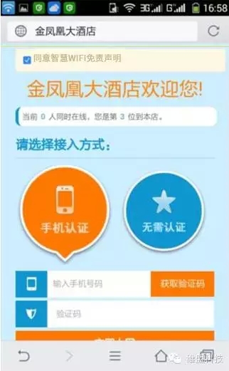 当用户的终端设备第一次连入维盟智慧WiFi网络时,需要选择相应的认证方式(可在智慧WiFi后台,自行设置认证方式),如下图: