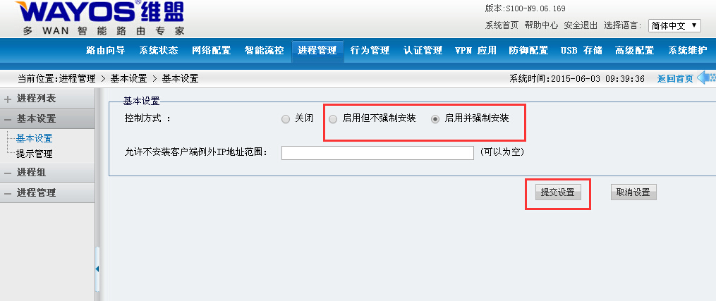 【进程管理】->【基本设置】->【基本设置】中去启用强制安装,然后点击提交。