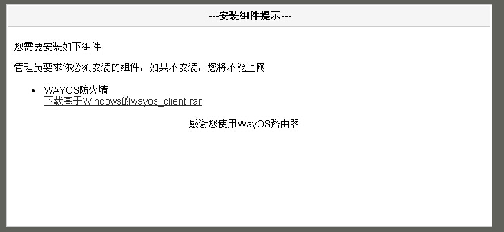 点击下载基于Windows client.rar就可以使用维盟路由器自带的客户端,也可以对这个提示页面用网页编辑器进行美化或者修改,然后再重新导入到路由器,修改提示界面时,默认客户端下载地址请不要修改,否则可能引起客户端下载地址出错。
