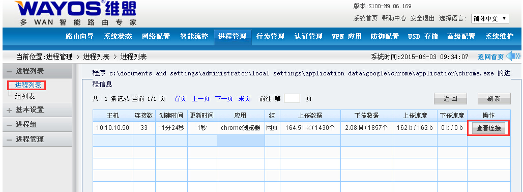 选择某一个应用(比如我们这里选择“chrome浏览器”),点击“查看”之后,可以看到打开网页、视频、游戏时所在主机IP地址,连接数,打开网页、视频或者启动游戏时的创建时间,更新时间,应用,组,上传数据,下传数据,上传速度,下传速度(如下图)。