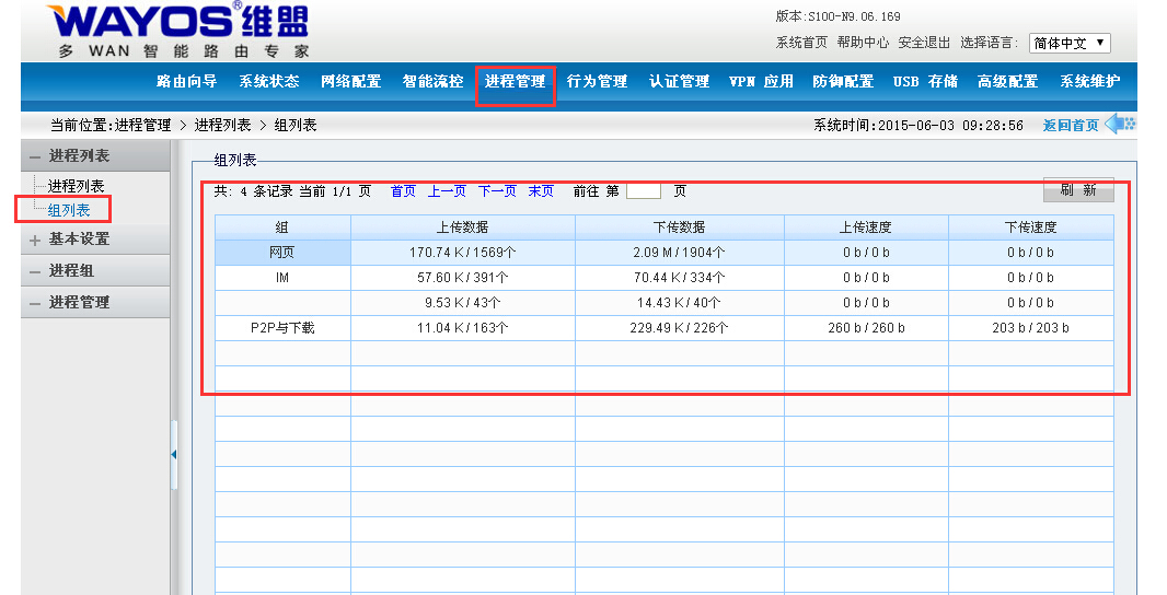 在【组列表】下,组列表中主要是记录所创建的组中,有什么组进程正在使用,及正在使用每个组中所有上传数据,下传数据,上传速度与下传速度。