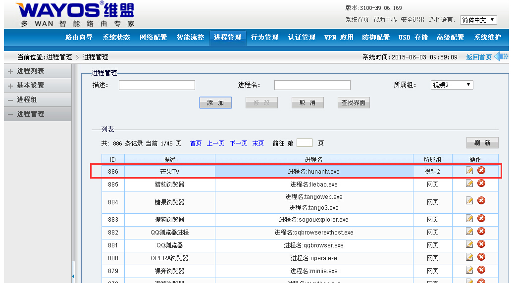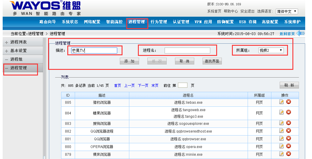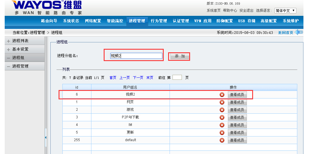 维盟路由器默认有进程组,用户可以在【进程管理】下的【进程组】,自己添加进程组。例如:我们这里添加“视频2”