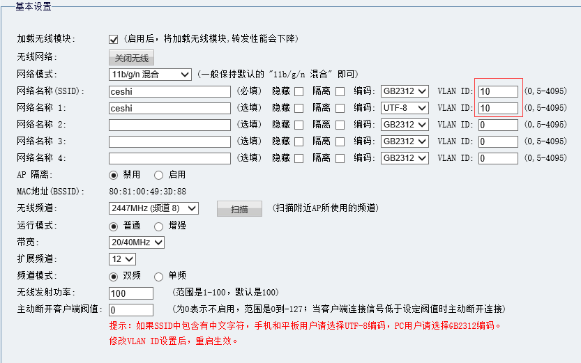 一丶设置AP(左边的)SSID且将对应的VLAN ID填好(图上测试填的是10)